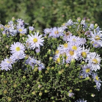 Цветение: светло-лавандовые полумахровые цветки с желто-зеленой сердцевинкой, продолжительное и обильное цветение с сентября до ноября.