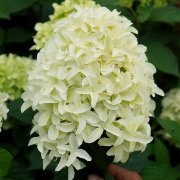 Цветение: соцветие у этого сорта крупное, 15-20 см и наполнено необычными, стерильными цветками, похожими на гиацинты. В народе этот сорт называют гиацинтовой гортензией. Распускается зеленоватыми, затем становится белым и позже приобретает розоватые оттенки. Цветёт с июля и до сентября.