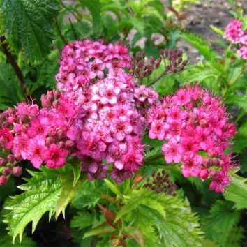 Цветение: бутоны карминного цвета. Цветки насыщенно розовые, почти малиновые, в больших, плоских, щитковидных соцветиях. Цветет на побегах текущего года. Цветение длится со второй половины июля по август. Растет быстро.