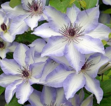 Цветки: Белые с голубыми краями, диаметр 15-20 см. Обильное цветение в мае-июне, затем менее обильное в августе-сентябре.