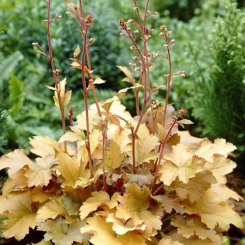 Листья: округлые, с волнистым краем. Они обладают насыщенным янтарным оттенком, в тени будут зеленоватыми.