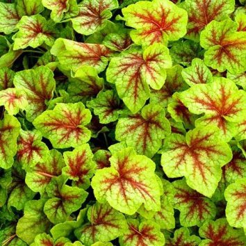 Листья: широкоовальные, яркого желто-зеленого цвета с выраженными темно-красными прожилками. Во второй половине лета изнанка листа покрывается белесоватым налетом.