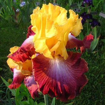 Цветение: светло-желтые верхние стандарты, тёмно-бордовые фолы с белым небольшим пятном под бородкой, белой снаружи и жёлтой внутри.