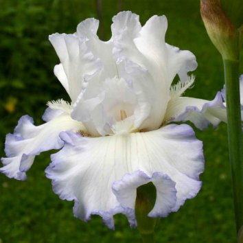 Цветение: стандарты (верхние доли) - кристально белые, кружевные, с легчайшим голубым ободком. Фолы (нижние доли) – также белые, но голубой цвет присутствует более весомо в виде тонких полосок и узенькой сине-сиреневой каймы. Бородка у этого цветка белая и практически теряется на общем фоне.
