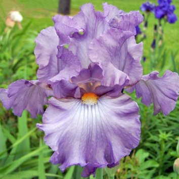 Цветение: цветы лавандово-фиолетовые, бородки темно-оранжевые.