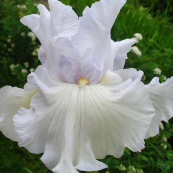 Цветение: цветок чисто белый с бело-лимонной бородкой.
