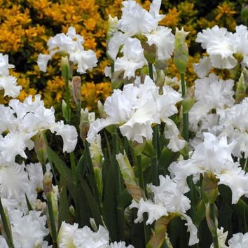 Цветение: цветок чисто белый. Бородки кремово-белые.