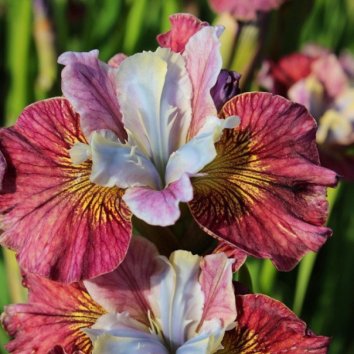 Цветение: цветки крупные, наружные лепестки красно-розово-сливовые, с более темными прожалками и желтыми вкраплениями. Центральные лепестки бело-сиреневые. Имеют легкий аромат. Цветение в июне.