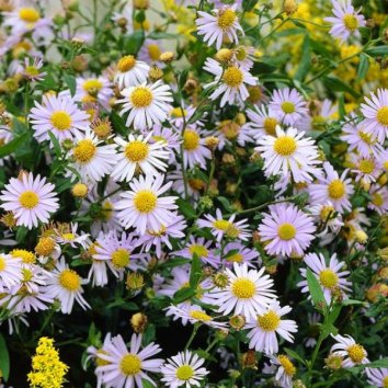 Цветение: цветки корзинки 3-3,5 см в диаметре, белые с нежно-пурпурными отблесками. Цветки диска трубчатые, желтые.