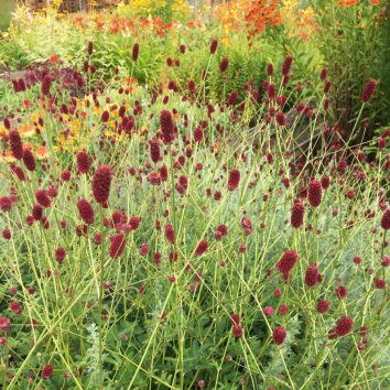 Цветение: цветет в июле-сентябре. Цветки мелкие, темно-бордовые, собраны в колосовидные соцветия в виде «шишечек».