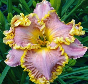 Цветки: Крупные воронковидные цветки напоминают лилию, расположены на прочных цветоносах. Лилово-лавандовые с очень пышной гофрированной золотисто-желтой каймой, размер 17 см, цветут в июне-июле.