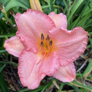 Цветки: цветки крупные, диаметром до 11-13 см., лососево-розовые, с желтым горлом и слегка заметным красноватым, тонким, гофрированным кантом по краю широких, плотных лепестков.