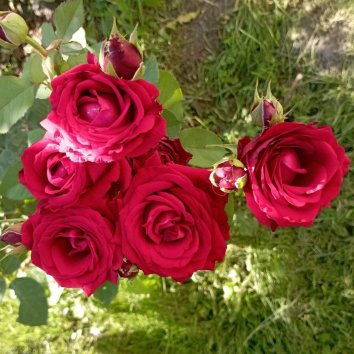 Цветы бокаловидные, темно-красные, густо-махровые, 55 - 75 лепестков, с приятным сладким ароматом, в роспуске достигают 13 см. Чаще одиночные, редко до 3 штук в кистях.