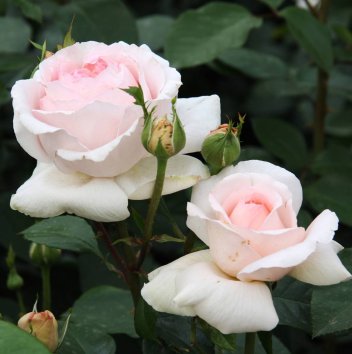 Цветки: раскрываются из шаровидных бутонов, показывая закрученный центр в старинном стиле. Внешние лепестки практически белые (точнее фарфорово-розовые), в то время как центр цветка насыщенно-розовый, с абрикосовыми тонами у основания. Сильный аромат мускуса, мирры и розы. Крупные, махровые цветы, очень пышные, в основном одиночные, собраны в небольшие соцветия, чашевидной формы. Цветет волнами в течение всего сезона.