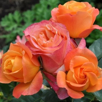 Цветы оранжево-жёлтые с розовыми краями. Цветет обильно, повторно.