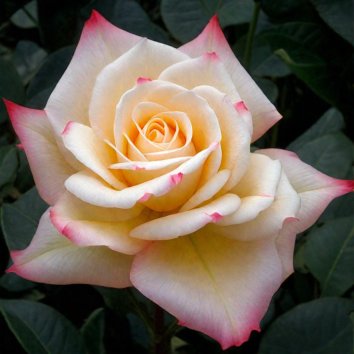 Цветки: классической формы состоят из 25-28 лепестков, кремовые с нежно-розовым румянцем по краям. Аромат легкий, классический розового масла. Диаметр цветка 11 см.