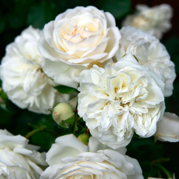 Цветки диаметром 8-10 см, махровые (более 25 лепестков), белые или почти белые, в соцветиях, остаются открытыми до 10 дней. Цветение повторное в течение сезона.