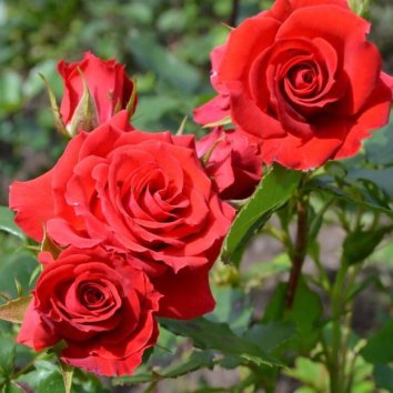 Цветки: крупные для флорибунды, полумахровые, красивы на всех стадиях роспуска. Только что распустившиеся бутоны алые, иногда почти оранжевые, позднее темнеют. Они хорошо выдерживают дождь. Появляются в кистях по 3-7 шт, хороши для срезки и выставок. Обильно цветет повторно.